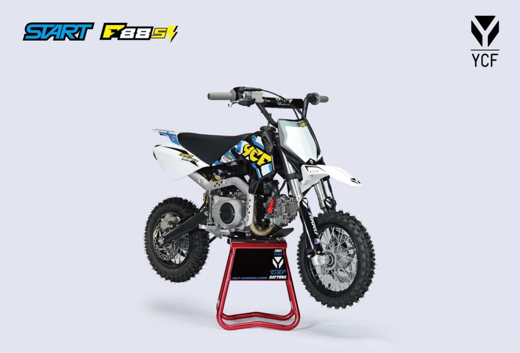 La Start 88 SE est utilisable dès 1m35 (avec selle basse et tés de fourche rabaissés). Elle dispose d’un démarreur électrique et d’une boîte de vitesses 4 rapports semi automatique (sans embrayage). Vous pouvez l’utiliser en changeant les rapports aux pieds à la volée, ou comme une moto automatique en la laissant sur le 3ème ou 4ème rapport. Dans ce cas, le démarrage du moteur se fait exclusivement au démarreur sur le rapport engagé. Dans ce mode, et grâce à sa molette de bridage, c’est la machine parfaite pour initier votre enfant à la moto en toute sécurité.